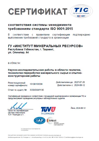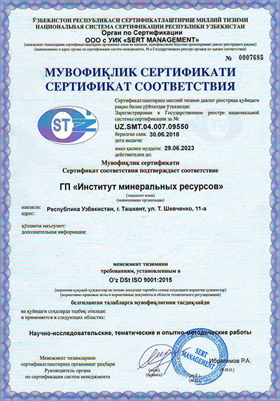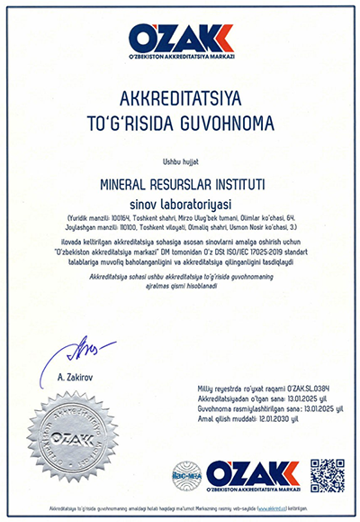 Центр аналитических исследований ГУ "Институт минеральных ресурсов" в начале 2025 года получил сертификат O'z DSt ISO/IEC 17025:2019, соответствующий международным требованиям, по национальному реестру O'ZAK.SL.0384.
